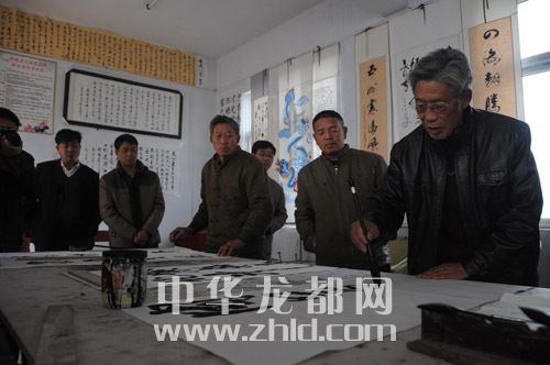 ????作為距離太康縣城最遠的一個邊界鄉(xiāng)鎮(zhèn),轉樓鄉(xiāng)的文化活動開展得有聲有色。該鄉(xiāng)依托文化站,成立了在鄉(xiāng)一級少見的文聯,下設書法家協會、腰鼓協會、嗩吶協會等。我們在轉樓鄉(xiāng)政府采訪時,正碰上書法家協會20多名會員在一起切磋書藝。今年74歲的許家榮是鄉(xiāng)書法家協會主席,也是《周口晚報》的老讀者,看到我們到來,老人興之所至,當場揮毫潑墨,為本報題寫了“周口邊界行接地氣有人氣”的條幅。據了解,每逢春節(jié),書法家協會會員都會走村串戶,為村民義務書寫春聯。