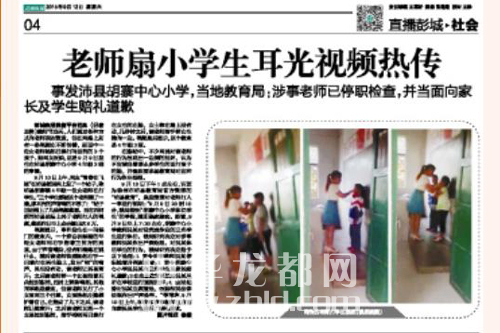 在等待調(diào)查結(jié)果的同時,記者通過網(wǎng)絡(luò)積極尋找與該視頻相關(guān)的信息。9月12日17時許,記者在當(dāng)天的《彭城晚報》上看到一則標(biāo)題為《老師扇小學(xué)生耳光視頻熱傳》的消息,報紙上刊登的圖片為視頻中的截圖。據(jù)報道,該事件發(fā)生在江蘇省徐州市沛縣胡寨中心小學(xué)。9月9日7時30許,胡寨中心小學(xué)老師吳某對沒有完成作業(yè)的3名學(xué)生進行體罰,后被人舉報。目前,涉事學(xué)校和老師已向家長和學(xué)生賠禮道歉。