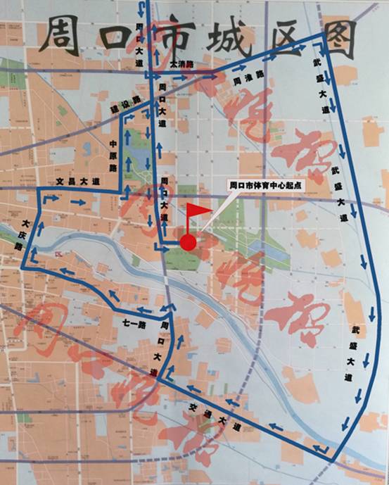 ????賽事初步確定報名參賽總人數(shù)為1萬人,其中,全程馬拉松2000人,半程馬拉松2000人,迷你馬拉松6000人。比賽路線(如圖)暫定為:市體育中心(起點)——周口大道——北高速口轉(zhuǎn)折——太清路——周淮路——武盛大道——周項路——周口大道——七一路——大慶路——文昌大道——中原路——建設路——周口大道——市體育中心(終點)。