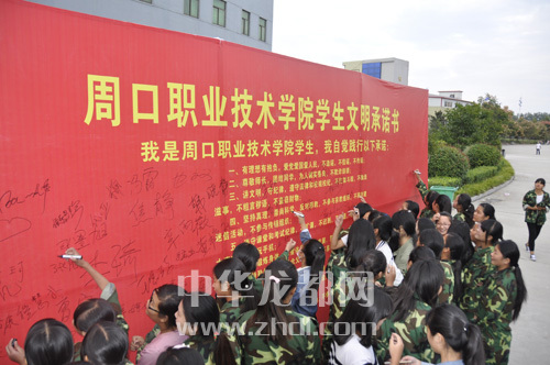 ????本報(bào)訊 昨日,周口晚報(bào)記者從周口職業(yè)技術(shù)學(xué)院了解到,新學(xué)期開始后,該校近萬名在校大學(xué)生簽訂了《學(xué)生文明承諾書》。承諾書中包含十條學(xué)生守則,為學(xué)生們的校園生活指明了方向。