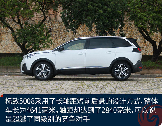 和市面上的一些7座SUV不同,標致5008采用了長軸距短前后懸的設計方式,這樣的設計更多的出現(xiàn)在運動派車型上。標致5008的整體車長為4641毫米,軸距卻達到了2840毫米,可以說是超越了同級別的競爭對手。