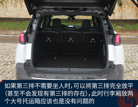 標致5008提供了三排座椅還有另外一個顯著的好處是,可以豐富行李廂的使用方式。通過實際體驗可以發(fā)現(xiàn),當三排座椅全部立起時,標致5008的行李廂基本能夠放下兩個登機箱,但如果第三排不需要坐人時,可以將第三排完全放平(甚至不會發(fā)現(xiàn)有第三排的存在),此時行李廂放兩個大號托運箱應該也是沒有問題的。