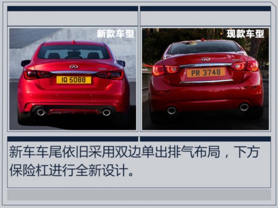 全新英菲尼迪Q50對外觀進(jìn)行了調(diào)整,前臉采用上下分體式格柵設(shè)計,上格柵為網(wǎng)狀造型,保險杠下唇為碳纖維材質(zhì)。車尾取消了車牌下方鍍鉻飾條以及兩側(cè)反光板,下方保險杠換裝黑紅雙色護(hù)板。