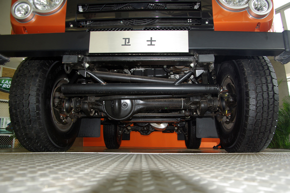 ????衛(wèi)士的底盤前視,衛(wèi)士作為一款硬派越野車,最小離地間隙達到了323mm(從圖上可以看到這一最小間隙位于前軸的差速器鼓包處),320mm的最小離地間隙意味著什么?一個人平躺在地面上,衛(wèi)士能從上方駛過而人不會有任何損傷。相比于一般SUV的200mm左右的最小離地間隙,衛(wèi)士顯然不在一個層級上。