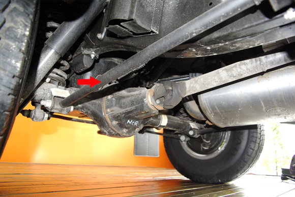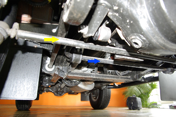 ????上圖中橙黃色箭頭為前軸的限位拉桿,不僅限制前軸自身發(fā)生扭轉(zhuǎn),也可對前軸的相對車架的前后位置進行限制。藍色箭頭為前防傾桿,目測粗細并不算大,相信這也跟衛(wèi)士不看重公路性能有關。