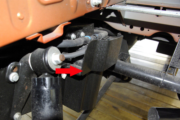 ????細節(jié)處,剎車的油管外側(cè)有護板(箭頭處)進行周全保護,有效杜絕越野時由車輪攪入的尖銳物體劃傷油管。