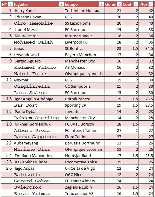 目前為止,凱恩已經(jīng)打進(jìn)21粒聯(lián)賽進(jìn)球,超過卡瓦尼、因莫比萊,高居歐洲金靴獎的第一名。梅西以19粒進(jìn)球位居第4。蘇亞雷斯近期狀態(tài)回暖,連續(xù)取得進(jìn)球,目前也收獲了15粒進(jìn)球,并列內(nèi)馬爾,位居第12名。