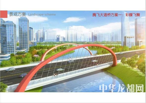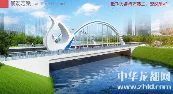 騰飛大道橋的設(shè)計(jì)方案有兩套,分別為“彩蝶飛舞”和“雙鳳呈祥”?!安实w舞”為下承式鋼管拱橋,寬36米。記者從效果圖中看到,橋兩側(cè)的拱圈,極具色彩感,給人一種賞心悅目的感覺(jué)。“雙鳳呈祥”為裝飾鋼管拱橋,寬36米。該橋采用“雙鳳”造型,象征天下太平,富含吉祥之意。