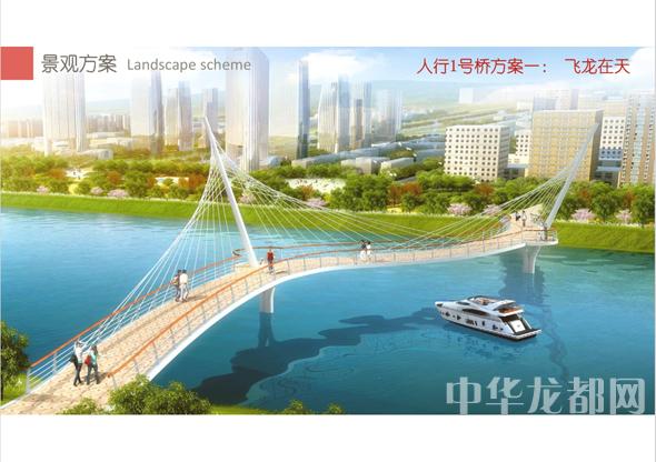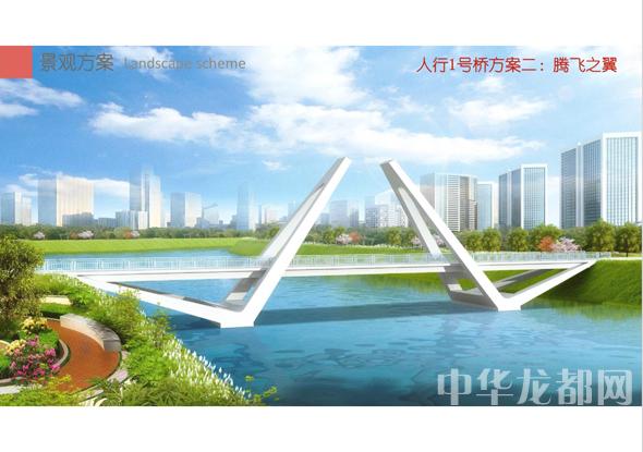 人行1號(hào)橋的設(shè)計(jì)方案有兩套,分別為“飛龍?jiān)谔臁焙汀膀v飛之翼”?!帮w龍?jiān)谔臁睘殡p塔斜拉橋。記者從效果圖中看到,該橋呈現(xiàn)出優(yōu)美的線條,宛如一條長(zhǎng)龍騰空在天?!膀v飛之翼”為V腿連續(xù)鋼箱梁橋。記者從效果圖中看到,橋體簡(jiǎn)潔流暢,時(shí)尚現(xiàn)代,橋墩形成穩(wěn)固的三角形,像兩只燕子展翅高飛。