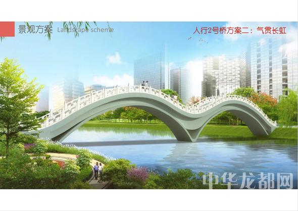 人行2號(hào)橋的設(shè)計(jì)方案有兩套,分別為“旭日東升”和“氣貫長(zhǎng)虹”?!靶袢諙|升”為圓形塔懸索橋。記者從效果圖中看到,該橋的橋塔為圓形,猶如一輪?wèn)|升的太陽(yáng),象征著城鄉(xiāng)一體化示范區(qū)蓬勃發(fā)展的未來(lái)?!皻庳為L(zhǎng)虹”為中承式系桿拱橋。該方案結(jié)合中國(guó)玉帶橋的古典元素、抽象古典幾何美學(xué),采用現(xiàn)代的設(shè)計(jì)手法,創(chuàng)作出現(xiàn)代感和中國(guó)傳統(tǒng)橋梁元素雜糅的橋梁設(shè)計(jì)。