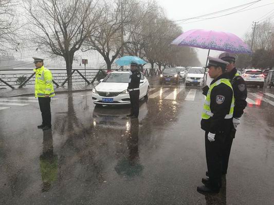 中華龍都網訊 (周口報業(yè)全媒體記者 侯俊豫 通訊員 王勇) 3月1日,淮陽縣在羲皇賓館上午下午分別召開全縣政法工作會議和紀檢監(jiān)察會議,參會人員分別達千余人。會議緊張進行了一天,淅淅瀝瀝的小雨下了一天。負責道路保障任務的交警大隊城市中隊民警冒雨執(zhí)勤從黎明到天黑,交警真的成了“澆警”,但執(zhí)勤民警克服惡劣天氣的影響,圓滿完成了會場附近道路保障工作。