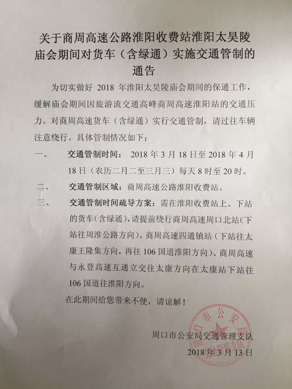 中華龍都網(wǎng)訊(周口報(bào)業(yè)全媒體記者 侯俊豫)3月13日,市交警支隊(duì)發(fā)布通告稱,為做好2018年太昊陵廟會(huì)期間的保通工作,緩解廟會(huì)期間商周高速淮陽(yáng)站的交通壓力。對(duì)商周高速貨車(chē)(含綠通)實(shí)行交通管制,請(qǐng)過(guò)往車(chē)輛注意繞行。現(xiàn)對(duì)商周高速貨車(chē)(含綠通)實(shí)行交通管制: