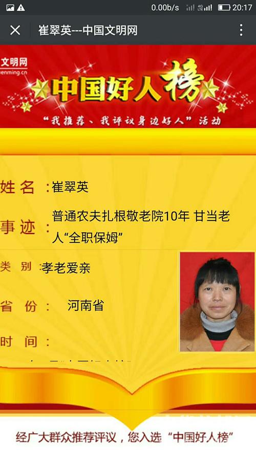 中華龍都網(wǎng)訊(周口報(bào)業(yè)全媒體記者馬治衛(wèi))3月30日晚,中國文明網(wǎng)發(fā)布消息:太康縣朱口官路沿村村民、太康縣朱口鎮(zhèn)敬老院院長助理崔翠英入選中國好人榜。