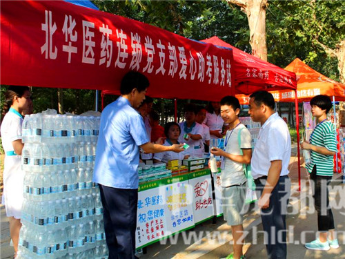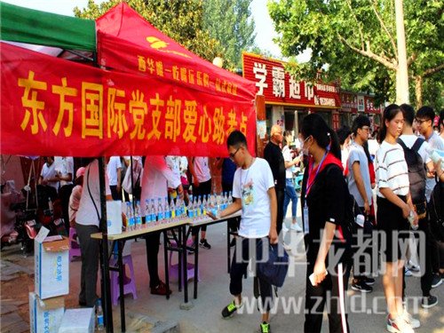 愛(ài)心助考活動(dòng)現(xiàn)場(chǎng),西華縣真愛(ài)醫(yī)院黨支部設(shè)立的“黨旗引領(lǐng)、護(hù)航高考”的大紅愛(ài)心助考條幅分外惹眼,黨員志愿者們免費(fèi)為考生提供藿香正氣水、風(fēng)油精、退燒藥等,并有醫(yī)護(hù)人員現(xiàn)場(chǎng)提供急救服務(wù)。在西華縣恒生醫(yī)院黨支部愛(ài)心助考點(diǎn)前,3名醫(yī)護(hù)人員正在免費(fèi)為考生及家長(zhǎng)提供風(fēng)油精、清涼油、仁丹、藿香正氣水等防暑降溫藥品和急救藥品,還有擔(dān)架、120急救車輛等。西華縣北華醫(yī)藥黨支部愛(ài)心助考服務(wù)站的黨員志愿者,正在向考生免費(fèi)提供防暑降溫藥、感冒發(fā)燒藥、拉肚子藥等藥品。黨員志愿者愛(ài)心企業(yè)代表宋女士說(shuō):“在高考期間,我們?yōu)榭忌凹议L(zhǎng)免費(fèi)提供礦泉水、芭蕉扇、清涼油等多項(xiàng)服務(wù),除了愛(ài)心,更多的是一份責(zé)任和使命?!?/p>
