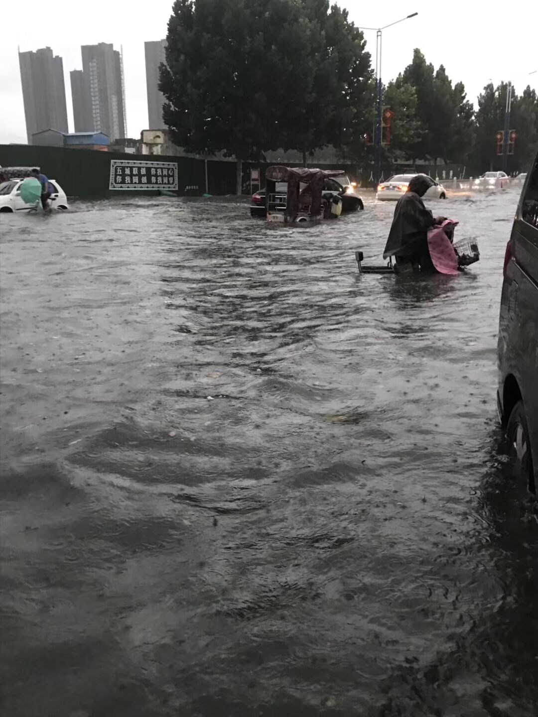 “在積水里行車必須加大油門,要不然積水容易倒灌進入排氣管內(nèi)?!彼緳C蔡先生說。而在周口市區(qū)慶豐街、五一路、光榮路等地的積水路段,均有車輛在水中拋錨。