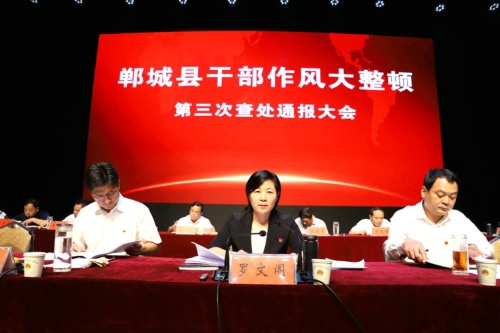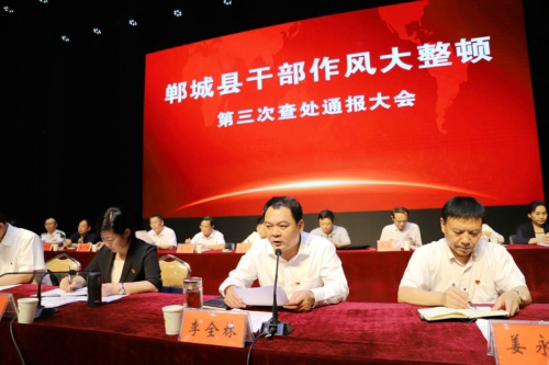 8月15日下午,鄲城縣召開(kāi)干部作風(fēng)大整頓第三次查處通報(bào)大會(huì)。貫徹全市干部作風(fēng)大整頓查處通報(bào)會(huì)議精神和縣委十二屆四次全會(huì)暨縣委工作會(huì)議精神,通報(bào)典型案例,宣布處理決定,傳導(dǎo)工作壓力,夯實(shí)工作責(zé)任,為進(jìn)一步推進(jìn)各項(xiàng)工作任務(wù)落實(shí)、打好打贏脫貧攻堅(jiān)戰(zhàn)提供堅(jiān)強(qiáng)有力的作風(fēng)保障。縣委書(shū)記羅文閣發(fā)表講話(huà),縣長(zhǎng)李全林主持。全縣副處級(jí)以上領(lǐng)導(dǎo)干部和縣、鄉(xiāng)、村各級(jí)各部門(mén)負(fù)責(zé)人參會(huì)。