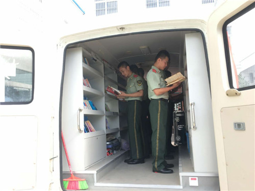 文化擁軍是商水縣圖書館的優(yōu)良傳統(tǒng)。當(dāng)天,流動(dòng)圖書車一來到縣武警中隊(duì)駐地,士兵們便不約而同圍了過來,有的走上圖書車尋找喜愛的圖書,有的則直接坐在車上,認(rèn)真翻閱書籍。戰(zhàn)士小劉表示:“我最喜歡人物傳記方面的圖書,今天他們送來了許多。我要充分利用這些圖書,讀好書、立好志、當(dāng)好兵,為實(shí)現(xiàn)中國夢、強(qiáng)軍夢和祖國的國防建設(shè)作出應(yīng)有貢獻(xiàn)。”