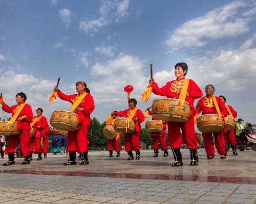 廣場(chǎng)上,一排排碩大的紅氫氣球高懸,氣球下縣掛著祝賀農(nóng)民豐收節(jié)的標(biāo)語(yǔ)。穿著各種鮮艷顏色的表演服裝的民間藝術(shù)表演隊(duì),給節(jié)日增光添彩,擂響盤鼓,為節(jié)日助威。從全縣23個(gè)鄉(xiāng)鎮(zhèn)起早趕來(lái)的46支民間藝術(shù)表演隊(duì)伍,伴隨著悠揚(yáng)的音樂(lè),喧天的鑼鼓在廣場(chǎng)上各顯其能。腰鼓、盤鼓、耍獅子、劃旱船、抬花轎、挑花籃、廣場(chǎng)舞也以不同的方式表達(dá)著豐收的喜悅。