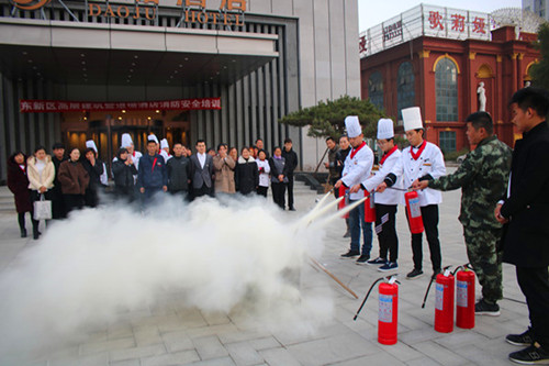 在培訓現(xiàn)場,為更好地將學到的知識與實踐相結合,大隊宣傳人員組織參訓人員開展了實地滅火消防演練,酒店全體員工分批次輪番上陣,通過使用滅火器及時迅速地撲滅火災操練,提高參訓人員正確規(guī)范使用滅火器材的能力,達到了良好效果。