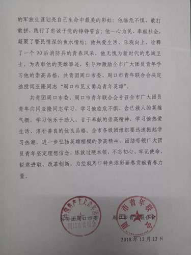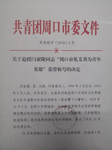 12月13日,記者從鄲城縣團(tuán)縣委獲悉,為表彰閆亞隆同志的英雄事跡,引導(dǎo)和激勵全市廣大團(tuán)員青年學(xué)習(xí)他的崇高品格,共青團(tuán)周口市委、周口市青年聯(lián)合會追授閆亞隆同志“周口市見義勇為青年英雄”稱號。