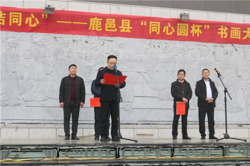 為慶祝改革開放40周年,深入學(xué)習(xí)習(xí)近平新時代中國特色社會主義思想和黨的十九大精神, 鞏固和發(fā)展愛國統(tǒng)一戰(zhàn)線,在新時代畫好最大同心圓, 團結(jié)和帶領(lǐng)各族各界人士深入挖掘中華優(yōu)秀傳統(tǒng)文化蘊含的思想觀念、人文精神、道德規(guī)范,讓中華文化展現(xiàn)出永久的魅力和時代風(fēng)采, 12月20日上午,由中共鹿邑縣委統(tǒng)戰(zhàn)部主辦、縣文學(xué)藝術(shù)界聯(lián)合會承辦、“天地人筆業(yè)”協(xié)辦的鹿邑縣“紀念改革開放四十周年·同心圓杯書畫大賽” 在城區(qū)問道苑廣場開展??h委常委、統(tǒng)戰(zhàn)部部長閆家明出席開幕式并講話??h委統(tǒng)戰(zhàn)部常務(wù)副部長李繼良,縣文聯(lián)主席王亞飛,副主席于連河以及本次全體獲獎和入展作者,文聯(lián)所屬各協(xié)會主席團成員近200人參加開幕式。