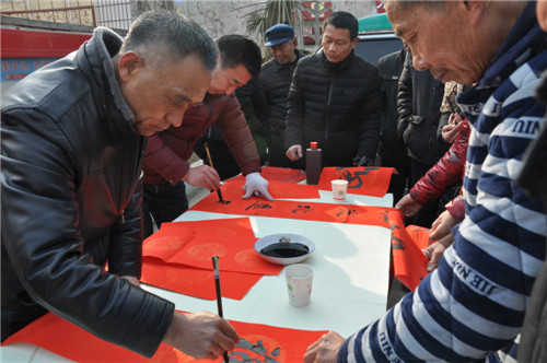 “我剛搬新家,要副大的對聯(lián)!”1月20日,在商水縣湯莊鄉(xiāng)西口村文化大院義寫春 聯(lián)現(xiàn)場,劉麗擠在人群著高聲對埋頭寫字的書法老師說。當(dāng)天,商水縣科協(xié)、湯莊鄉(xiāng) 政府聯(lián)合主辦的“快樂星期天”暨“道德模范”表彰大會在這里舉行。