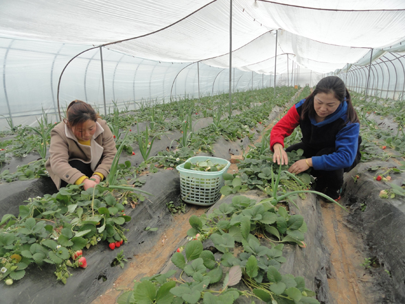 2月27日,商水縣鄧城鎮(zhèn)返鄉(xiāng)創(chuàng)業(yè)標兵、鎮(zhèn)人大代表馮杰(右)對草莓進行疏葉管理。馮杰在鎮(zhèn)人大、工商聯(lián)幫助下創(chuàng)辦了生態(tài)葡萄園,并種植了溫室草莓,安排了50名貧困戶就業(yè)。