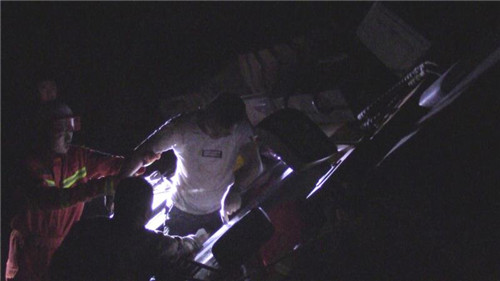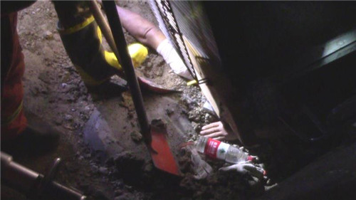 指揮員在與司機溝通時發(fā)現(xiàn),由于車身很重,司機手臂很快出現(xiàn)血液流通不暢、知覺微弱現(xiàn)象,如不及時脫困,后果十分嚴(yán)重。情況緊急,救援人員先利用剪擴器對駕駛室與被困人員手臂處進行擴張,但由于車身較重,地面所墊硬物無法承受壓力,擴張器無法發(fā)揮作用。隨后,救援人員利用鐵鍬在被困人員手臂下進行挖土,5分鐘后,隨著空間的逐漸擴大,被困人員手臂被小心翼翼抽回,司機成功脫困,消防指戰(zhàn)員從駕駛證另一側(cè)把他救出。