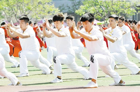 4月18日上午,周口師范學(xué)院第十五屆田徑運(yùn)動(dòng)會(huì)開(kāi)幕,來(lái)自該校各個(gè)學(xué)院的數(shù)千名學(xué)子投入運(yùn)動(dòng)會(huì)健身活動(dòng)中。700多名大學(xué)生在運(yùn)動(dòng)會(huì)上集體表演了心意六合拳,受到觀眾熱捧。記者 梁照曾 攝