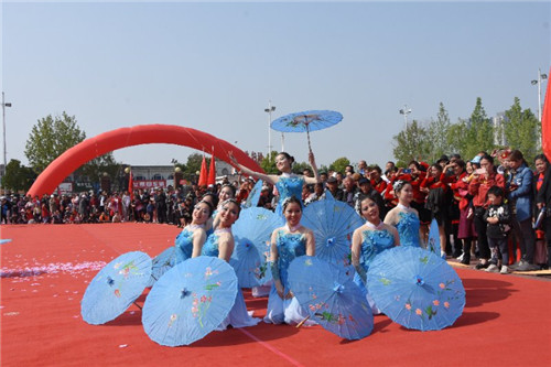 比賽進(jìn)行到將近一半時(shí)候,縣第二實(shí)驗(yàn)小學(xué)參賽隊(duì)帶來(lái)的舞蹈《麗人行韻》將大賽推向了高潮。表演開(kāi)始,身著天藍(lán)漸變色長(zhǎng)裙的38名姑娘手持彩傘一字列隊(duì)緩步入場(chǎng),正當(dāng)觀眾們看得入神時(shí),她們突然將彩傘都齊刷刷地舉過(guò)頭頂并瞬間打開(kāi),無(wú)數(shù)粉紅色的花瓣從彩傘中紛紛飄落,像從碧藍(lán)的天空中下起了無(wú)盡的花瓣雨。選手們短短幾秒鐘的舉動(dòng),在廣場(chǎng)上勾勒出了一個(gè)人間仙境,引人入勝。在粉紅花瓣的映襯中,傘下腳步輕盈的女子們微微舞動(dòng),美若天仙,婀娜多姿,展現(xiàn)了“人面桃花相映紅,桃花依舊笑春風(fēng)”的作品主題。