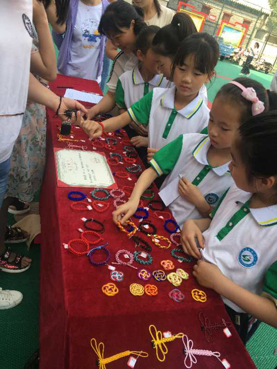 5月25日上午,沈丘縣中國結(jié)第七代傳承人李?;ㄗ哌M槐店鎮(zhèn)回民小學,和學校“中國結(jié)”手工編織興趣班的20名學生舉行“愛心義賣,情暖校園”主題活動。不到半小時,100多件作品被搶購一空還預(yù)定了很多。據(jù)悉,這次義賣共得到1200余元,將全部捐給“槐店鎮(zhèn)中心學校教育基金”,用來資助該鎮(zhèn)經(jīng)濟困難師生、獎勵優(yōu)秀教師和學生、資助教育教研等重大活動項目。