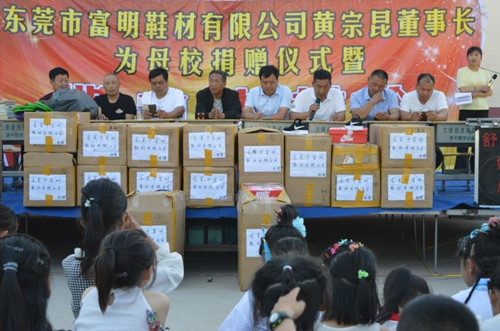 當(dāng)日下午,廣東東莞富明鞋材有限公司董事長(zhǎng)黃宗昆為母校薛廟小學(xué)師生捐贈(zèng)愛心運(yùn)動(dòng)鞋儀式在馬頭鎮(zhèn)薛廟小學(xué)舉行。馬頭鎮(zhèn)中心校副校長(zhǎng)李永長(zhǎng)、中心校辦公室主任章紅勝、薛廟行政村黨支部書記黃志華等村兩委領(lǐng)導(dǎo)、校長(zhǎng)黃景思、名譽(yù)校長(zhǎng)孫道紅、全校260 多名師生及部分學(xué)生家長(zhǎng)600多人參加了當(dāng)天的捐贈(zèng)儀式。