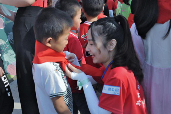 開班儀式上,鄭州升達(dá)經(jīng)貿(mào)管理學(xué)院的支教老師為同學(xué)們佩戴了紅領(lǐng)巾,伴隨著國歌進(jìn)行了升國旗教育,支教老師進(jìn)行集體宣誓。支教老師代表作表態(tài)發(fā)言時(shí)說:“很高興能夠來鹿邑周樓小學(xué)支教,作為一名當(dāng)代青年大學(xué)生,我們能夠擔(dān)當(dāng)重任,吃苦耐勞,全身心地完成兩周的支教活動(dòng),與孩子們快樂相處。”