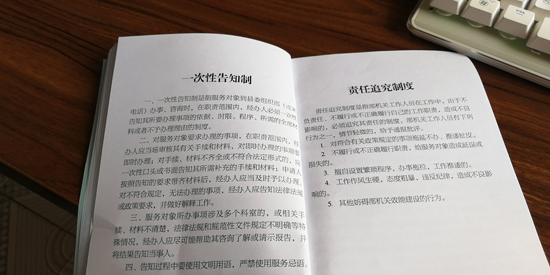 制度規(guī)定,服務(wù)對(duì)象到縣委組織部辦事、咨詢或來電時(shí),首個(gè)接待的工作人員必須熱情、禮貌、耐心接待辦理或引領(lǐng)交給相關(guān)職責(zé)科室辦理。凡符合規(guī)定,手續(xù)齊全的,限時(shí)辦結(jié),手續(xù)不全未能及時(shí)辦結(jié)的,要主動(dòng)向服務(wù)對(duì)象說明原因……縣委組織部常務(wù)副部長薛斌告訴記者:“通過扎牢制度的籠子,讓部機(jī)關(guān)工作人員做到一張笑臉迎客,一把椅子讓座,一杯茶水暖心,一顆誠心辦事,一流業(yè)績爭先的服務(wù)標(biāo)準(zhǔn),切實(shí)達(dá)到門好進(jìn)、臉好看、話好聽,事好辦的目的?!?/p>