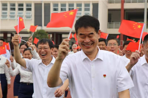 伴隨著琵琶悠揚(yáng)的旋律,在場(chǎng)人員揮舞手臂,舞動(dòng)國旗,共同唱響《我和我的祖國》。激情澎湃的歌聲響徹第二實(shí)驗(yàn)小學(xué)每一個(gè)角落,訴說著鄲城教育人對(duì)祖國的衷心熱愛和真誠歌頌。
