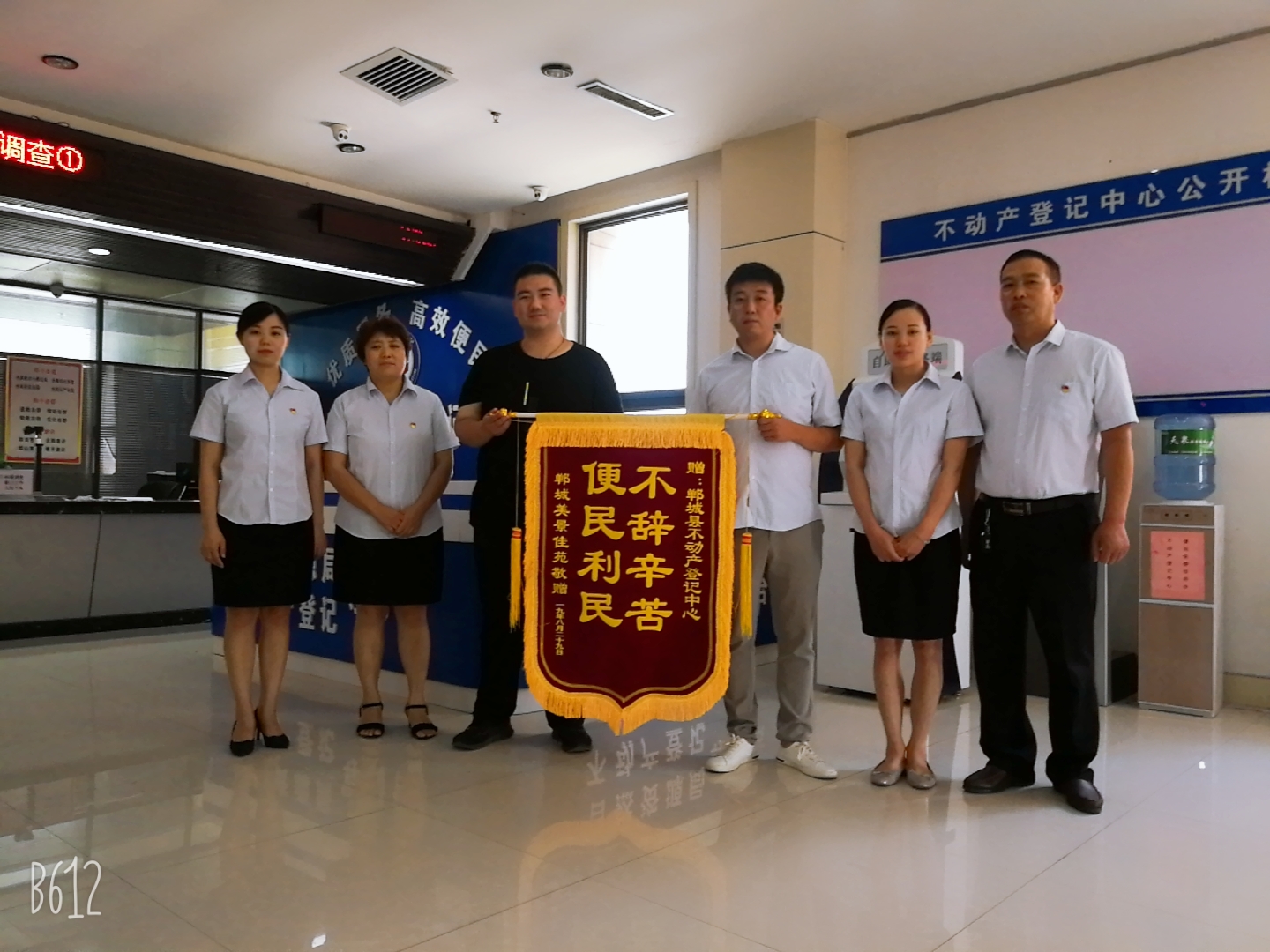 近日,河南博騏置業(yè)有限公司工作人員來到鄲城縣不動產(chǎn)登記中心,將一面印有“不辭辛苦,便民利民”的錦旗送到了中心負責人手中,對不動產(chǎn)登記中心真心為民的服務態(tài)度和高效的辦事效率表示感謝,點贊窗口“熱情、文明、高效”的服務。