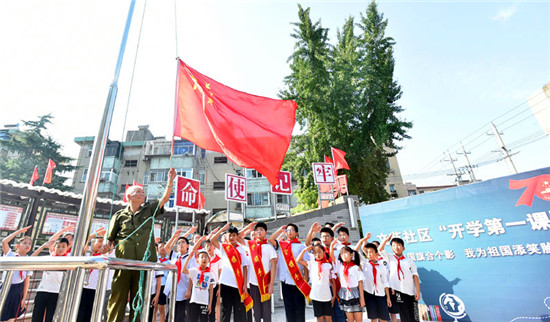 伴著雄壯的國歌聲,30多名孩子目不轉睛地看著國旗冉冉升起……為迎接新中國成立70周年,近日,江蘇省揚州市邗江區(qū)雙橋街道文苑社區(qū)在社區(qū)國旗臺廣場,組織開展了開學第一課“我與國旗合個影、我為祖國添笑臉”活動。鮮艷的五星紅旗、燦爛的孩子笑臉,組成了一幅和諧美麗的畫面。