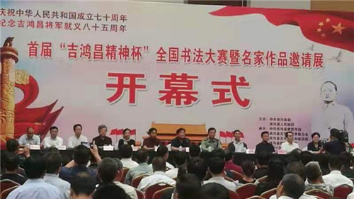 為紀(jì)念抗日民族英雄吉鴻昌將軍就義85周年,大力弘揚(yáng)愛國主義精神和中華民族優(yōu)秀傳統(tǒng)文化,9月28日上午,首屆“吉鴻昌精神杯”全國書法大賽暨名家作品邀請展在扶溝縣體育館隆重舉行。原廣州軍區(qū)政治部副主任陳大民少將、解放軍報(bào)社原副社長田仁德少將、解放軍報(bào)社原副總編孫臨平少將、解放軍裝備學(xué)院原副政委孫南京少將、解放軍總后勤部某研究所原所長楊廷欣少將、吉鴻昌將軍親屬鄭吉安大校,市委常委、周口軍分區(qū)政委孫先振,市政協(xié)副主席張文平,扶溝縣四個班子領(lǐng)導(dǎo)及副處級干部等出席開幕式??h委副書記、政法委書記詹凱主持儀式。