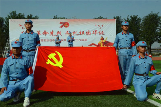 當(dāng)天上午,小朋友在家長(zhǎng)和老師的帶領(lǐng)下,身穿紅軍軍服,手里揮動(dòng)著小紅旗,鮮嫩的小臉蛋上貼著小國(guó)旗,雄赳赳氣昂昂地走在體育場(chǎng)上,邁著整齊堅(jiān)定的步伐,昂首挺胸,高唱國(guó)歌,共同祝福偉大的祖國(guó)70華誕。