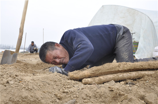11月26日,沈丘縣白集鎮(zhèn)40多歲的耿金中與另外兩個同伴一起來到周口城鄉(xiāng)一體化示范區(qū)許灣鄉(xiāng)肖王莊,未來的一段時間,他們吃住都將在這里進行,直到將這一區(qū)域的山藥挖完。耿金中說,他挖山藥已經(jīng)有20多年了,20多年前,沈丘縣大規(guī)模種植山藥,每到收獲時,會有很多山東挖山藥工人來這里挖山藥。他看到這個行當能賺錢,就開始學(xué)挖山藥技術(shù)。此后的多年,他先后到山西、湖北、安徽等地挖山藥。