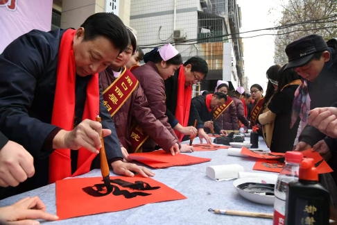 18日上午9時30分,位于新建街的周口儷嬰婦女兒童醫(yī)院門前喜氣洋洋,張燈結(jié)彩,熱鬧非凡,儷嬰婦女兒童醫(yī)院邀請市書協(xié)、川匯區(qū)書協(xié)的書法家們,在門前為“送福送健康暨書法家義寫春聯(lián)”活動舉行了簡短的儀式,隨即活動展開,一邊是儷嬰婦女兒童醫(yī)院的專家們將坐診臺搬到門前,細(xì)致地為來往的居民免費量血壓、把脈等義診,一邊擺下10多張桌子和筆墨紙硯,中國書協(xié)會員游保峰,著名書法家、川匯區(qū)書協(xié)終身名譽主席李大慶,書法家馮干敏、李輝、李國斌及川匯區(qū)書協(xié)主席李尊杰,市書協(xié)副主席劉廣巖,川匯區(qū)書協(xié)副主席兼秘書長杜忠義,副主席曾祥峰、何楠,著名書法家寇成義等書法家們,展開大紅的紙張,揮毫潑墨,飄著墨香的福字和一對對大紅的春聯(lián),帶著新春的祝福,送到居民手里,一波波居民到自己喜愛的書法家面前,喜討福字和春聯(lián),開心的喜悅洋溢著臉上……