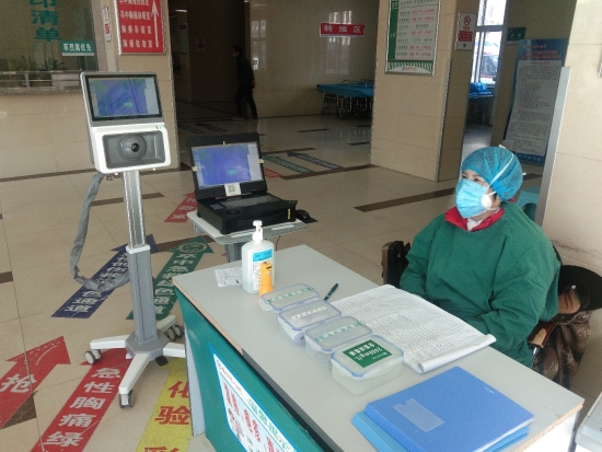 2月18日,記者在周口市中心醫(yī)院急診科看到,一臺(tái)醫(yī)用紅外熱像儀出現(xiàn)在急診科的大門口,前來就診的患者必須通過該熱像儀的檢測才能進(jìn)入急診科就診?!扒皝砭驮\的患者只需要在熱像儀前經(jīng)過,熱像儀就會(huì)在屏幕上自動(dòng)顯示患者的體溫信息,一旦出現(xiàn)體溫偏高的人,熱像儀就會(huì)自動(dòng)報(bào)警,并不需要人工檢測,提高了檢測效率?!痹谠摕嵯駜x前做紀(jì)錄的醫(yī)務(wù)工作者說。 記者 張洪濤 攝