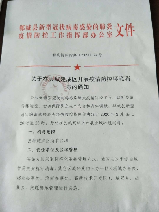 2月19日,記者從鄲城縣新冠肺炎疫情防控指揮部了解到,《鄲疫情防指辦〔2020〕24號》指出,為加強(qiáng)新型冠狀病毒感染肺炎疫情防控工作,切斷疫情傳播途徑,切實(shí)保障民眾生命安全和身體健康,鄲城縣新型冠狀病毒感染肺炎疫情防控指揮部決定于2020年2月19日20時至23時,開始在縣城建成區(qū)開展全域環(huán)境消毒。