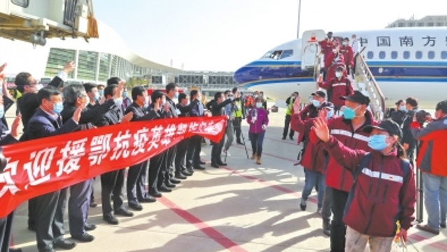 3月30日上午,湖北武漢,《歌唱祖國》響徹云霄。鄲城縣援鄂抗疫的5名醫(yī)護隊員隨河南醫(yī)護隊一道,完成使命、起程凱旋,今天下午到周口。