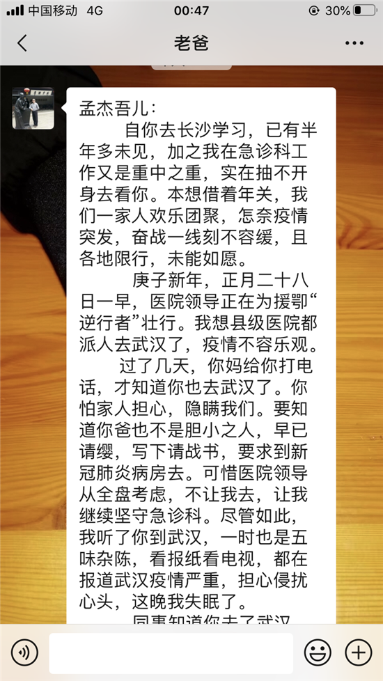 作為父親,我為你擔(dān)心;身為一名醫(yī)院的老兵,我為你驕傲;我服務(wù)家鄉(xiāng),你支援前線。孟杰吾兒,子承父業(yè),我是醫(yī)生,你為護士;疫情重于泰山,你沒有退縮,我很欣慰,即使你第一時間告訴我,我也會全力支持你的。