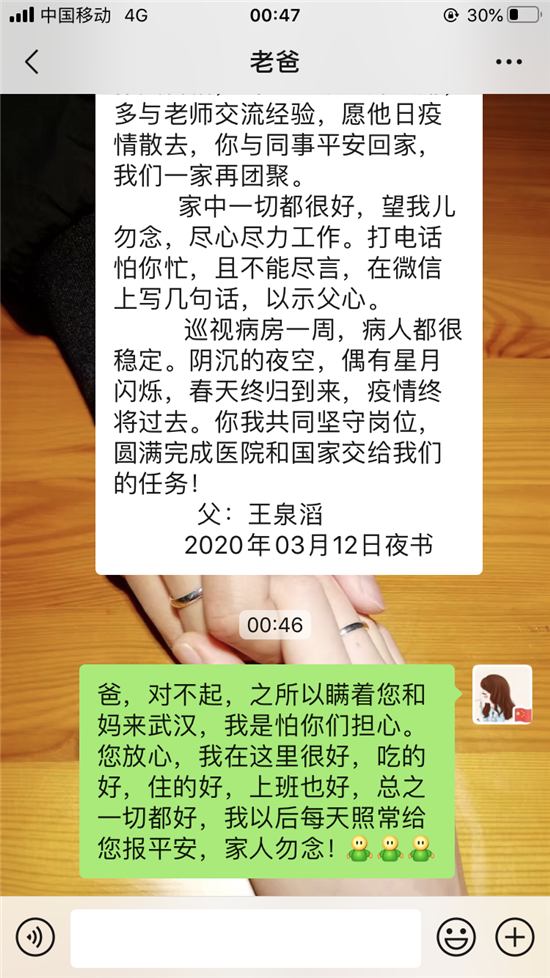 3月21日,周口援鄂醫(yī)療隊出征滿一月。當(dāng)晚,王泉滔通過微信又鄭重給女兒說下這番話:一晃你在武漢一個月了,我和家人從你去武漢的擔(dān)心到現(xiàn)在的放心,這是國家給予我們的安心。農(nóng)民把地種好,教師把學(xué)教好,士兵把國門守好,醫(yī)護把病治好,都是自己的使命,更是自己的初心。人人懷揣私字,社會必敗,遭殃的終歸眾人;眾人心懷天下,萬物皆勝,受益的定是人人。看到河南部分援鄂醫(yī)療隊從武漢凱旋歸來,雖然沒有你的身影,但是我們很高興,說明武漢的疫情已得到控制,我和家人一起期盼你早日歸來。但是還是要再次叮囑你,不要因為疫情到了最后而放松警惕,上下班路上注意安全,穿脫防護服不能有一絲懈怠,時刻保持警醒。年前你當(dāng)了姑姑,雖然還沒有見到你侄子,但他和家人共同期待你平安回來。吾兒加油!