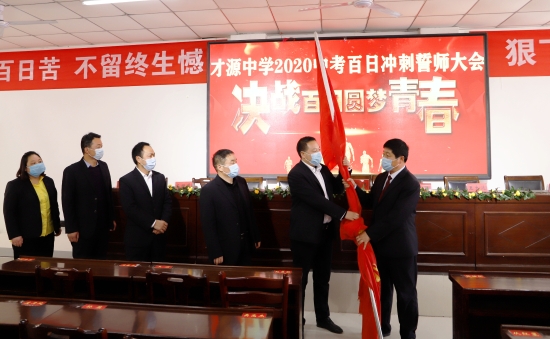 誓師大會現(xiàn)場,才源中學校長張醒民向九年級階段負責人授戰(zhàn)旗。師生代表面對直播鏡頭向全體初三師生發(fā)出鏗鏘誓言,號召大家奮勇爭雄,2020年再奪中考全市領先的佳績。誓詞為:凌志擎天,豪氣滿懷;天道酬勤,樂戰(zhàn)不??;意堅心恒,信念常在;以我雄心,征戰(zhàn)未來;沖刺百日,只為無悔青春;人生綻放,定是風雨兼程;今日苦讀書厲兵秣馬,明朝進重點吐氣揚眉。