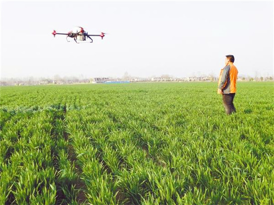 3月24日,在沈丘縣周營(yíng)鎮(zhèn)平安農(nóng)業(yè)種植合作社訂單優(yōu)質(zhì)小麥種植基地,身穿“黃馬甲”的小麥飛防技術(shù)員正操作無(wú)人機(jī),進(jìn)行“一噴多防”病蟲(chóng)害防治,為夏糧豐產(chǎn)豐收奠定基礎(chǔ)。謝辛凌 攝