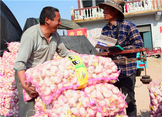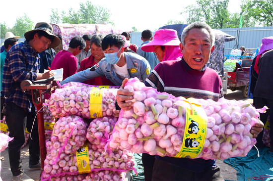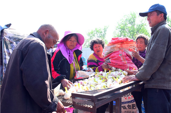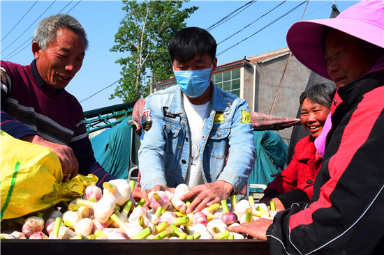 4月26日下午,記者在淮陽縣王店鄉(xiāng)107國道沿線看到,各個大蒜的收購點(diǎn)車來車往,蒜農(nóng)們拉著新蒜賣給小販們。盡管今年春季雨水較少,天旱土地墑情較差,但是上萬畝大蒜,在蒜農(nóng)們施肥澆水管理下,長勢不錯,每畝產(chǎn)量在3000斤到4000斤之間,迎來疫情下的大蒜豐收。