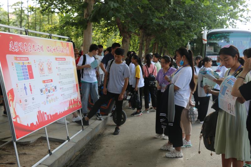 在該縣各標(biāo)準(zhǔn)化高考考點(diǎn)征兵宣傳現(xiàn)場,人頭攢動(dòng)、熱鬧非凡?!昂媚袃?,來當(dāng)兵”大紅條幅和“把忠心獻(xiàn)給祖國,把青春獻(xiàn)給軍營”“參軍報(bào)國盡義務(wù),熱血青年競風(fēng)采”的大型宣傳牌格外引人注目,內(nèi)容豐富的征兵宣傳展板一字排開,《征兵宣傳手冊(cè)》《大學(xué)新生應(yīng)征入伍宣傳單》《征兵政策宣傳解讀手冊(cè)》等征兵宣傳資料擺放在咨詢臺(tái)上一目了然,吸引了眾多的考生和家長駐足觀看,圍著咨詢臺(tái)詢問有關(guān)征兵事宜。
